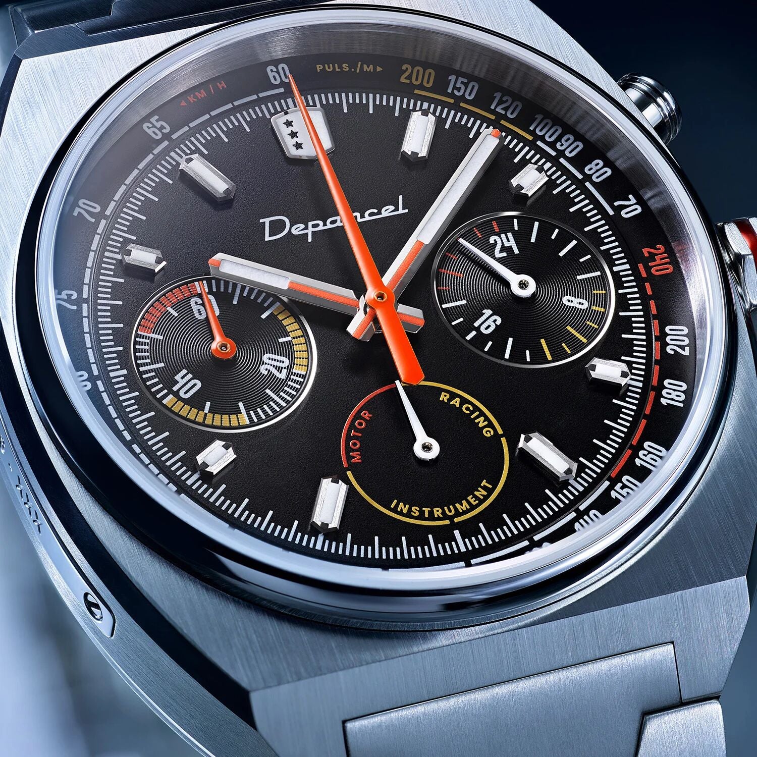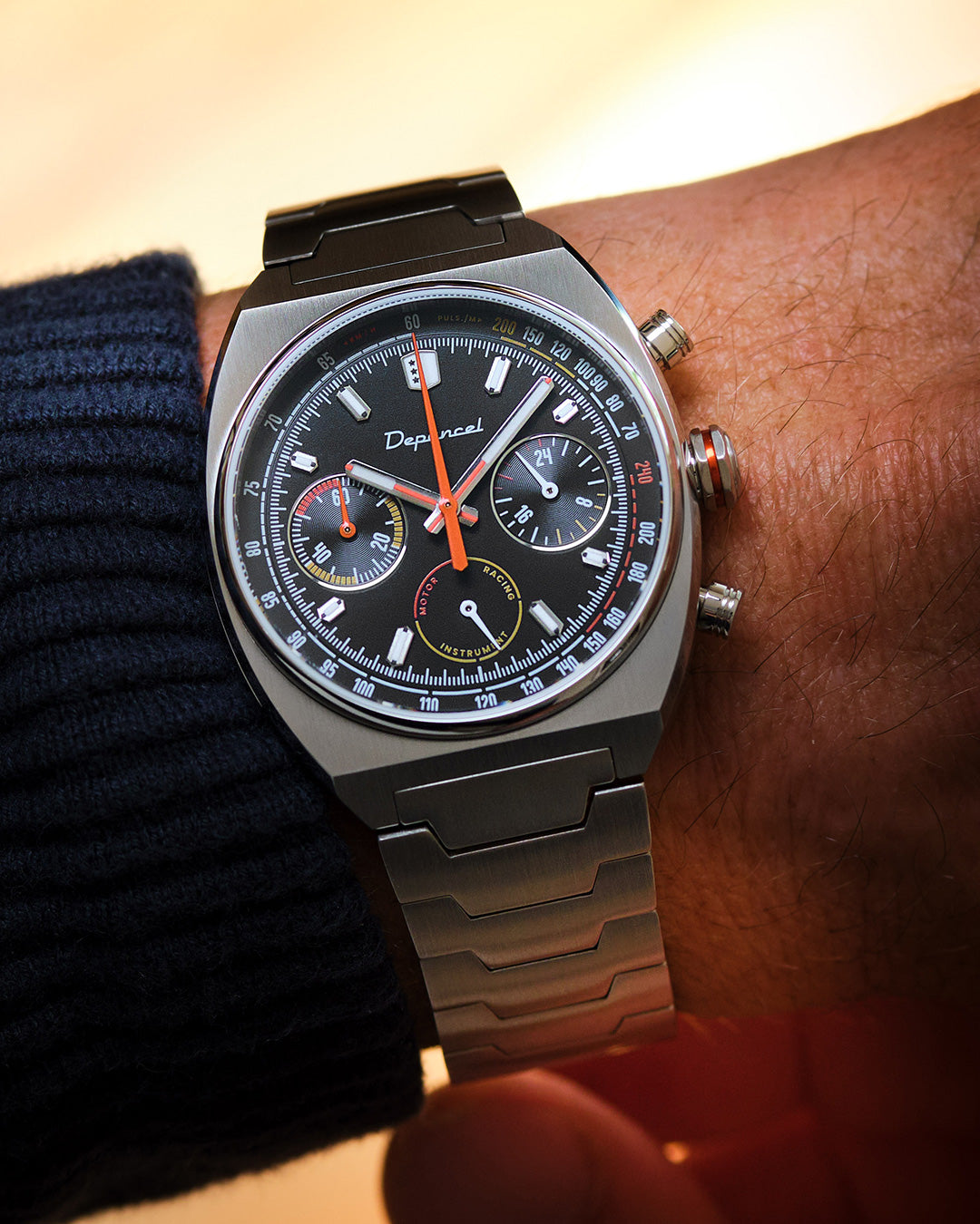 Les années 70 ont été une décennie moderniste à la créativité stylistique affirmée. C’était aussi le temps des audaces techniques débridées, non seulement pour le sport automobile, mais aussi pour l’horlogerie avec les nouvelles performances en matière de précision offertes par le quartz. Depancel ne pouvait faire l’impasse sur cette technologique pour célébrer cette époque et c’est tout naturellement que les équipes ont fait le choix d’un mouvement Méca-Quartz pour cette nouveauté.