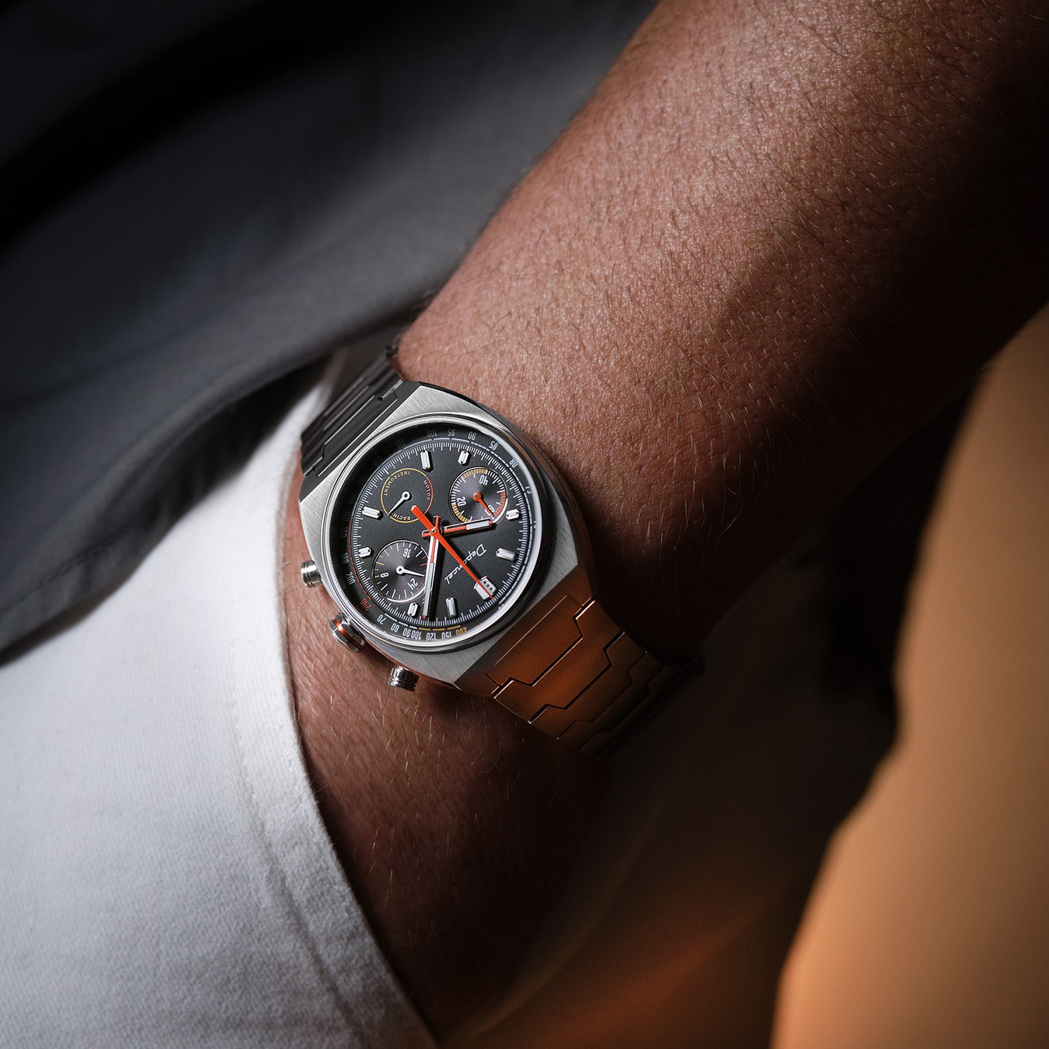 Les éléments décoratifs de ce garde-temps sportif adoptent des couleurs vives pour faciliter la lecture. Le rouge et l’orange, présents dans les trois compteurs auxiliaires et sur l’échelle tachymétrique graduée pour le sport automobile, sont typiques des années 70. Des couleurs typées qui collent parfaitement à la philosophie et à la forme affirmée de ce chrono tri-compax très racé, que l’on imagine sans peine au poignet d’un pilote de cette époque-là.
