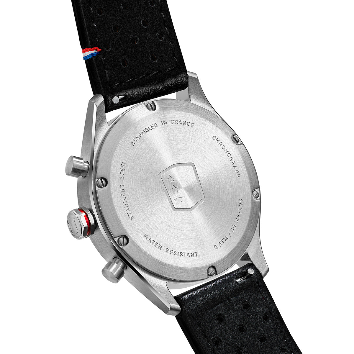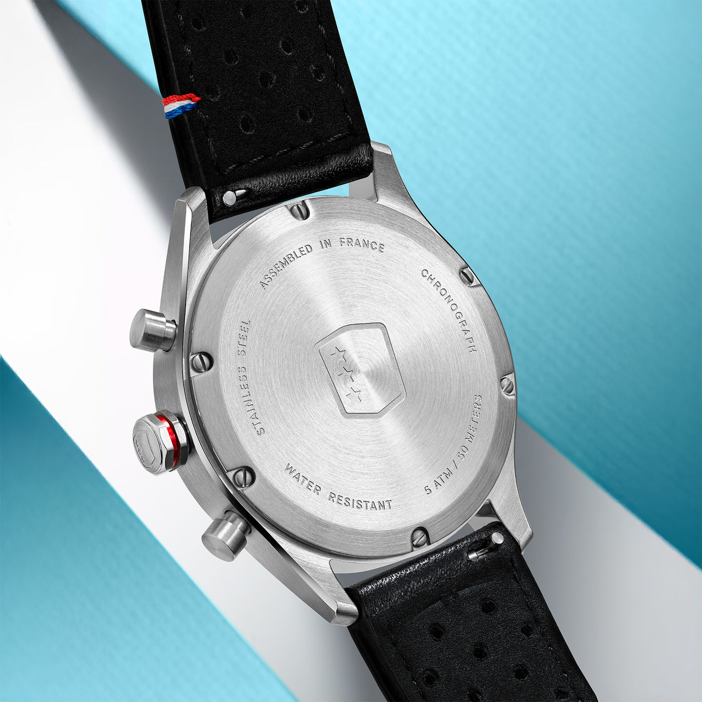 Confortable et équilibrée, la montre est montée sur un bracelet en cuir de veau noir, doublé de matière synthétique pour une meilleure tenue dans le temps. Étanche à 5 ATM, elle se porte avec assurance dans toutes les situations de la vie courante. Avec son poids de 68 g, elle affiche une présence affirmée mais reste agréable à porter au fil de la journée.