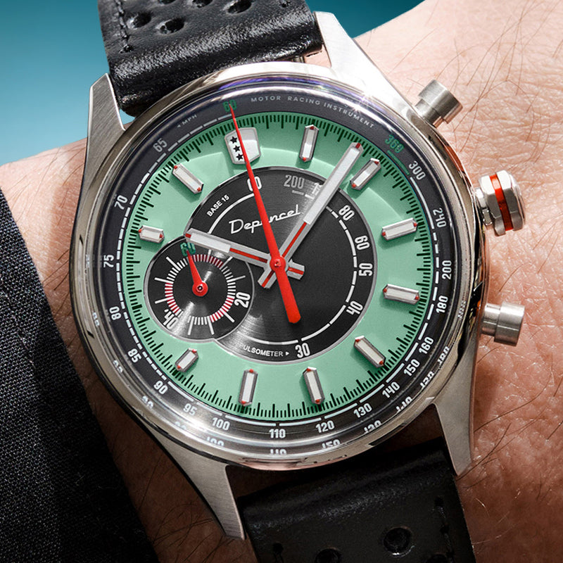 Derrière son cadran vert menthe audacieux se cache le calibre Seiko VK63, un mouvement méca-quartz reconnu pour sa fiabilité et sa précision. Ce mécanisme hybride combine la rigueur du quartz à l’élégance d’un affichage chronographe mécanique, avec une aiguille centrale au balayage fluide. Une alliance parfaite entre esthétique vintage et performance contemporaine, au service d’une pièce horlogère pensé pour les passionnés de vitesse, de style, et d’exigence. Avec cette nouveauté, Depancel continue de repousser les limites de l’accessibilité sans compromis.