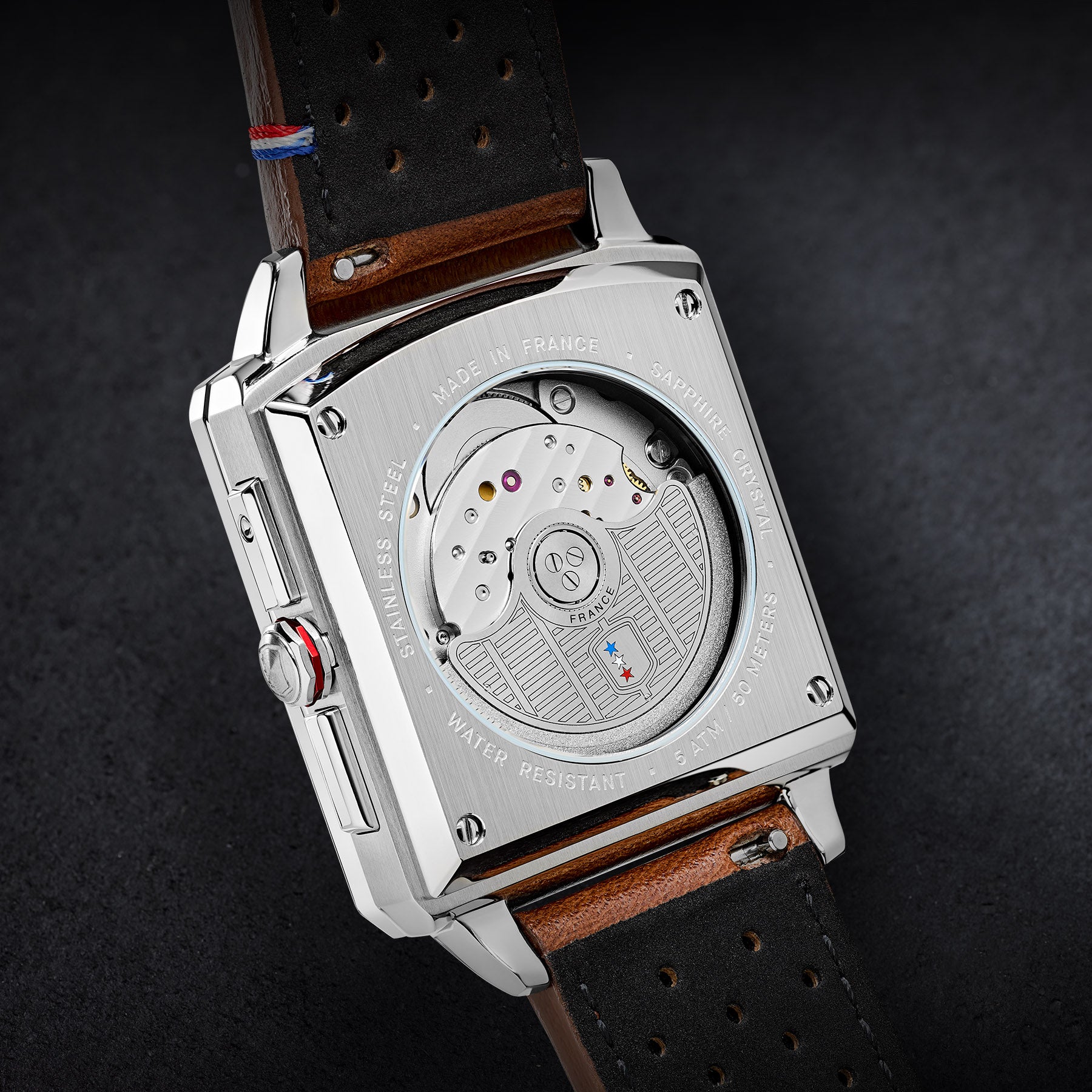 Avec son design carré unique, inspiré des calandres des voitures de sport classiques, la Série R01 arbore un boîtier en acier inoxydable de 43x36mm, aux arêtes dynamiques, biseautées à 6h et 12h pour une ergonomie parfaite et un confort naturel au poignet. Le dessus du boîtier présente un brossage vertical, tandis que les flancs alternent un brossage horizontal et des zones polies pour un subtil jeu de contrastes. Le tout est paré d’un verre saphir taillé en biseau prolongeant harmonieusement les lignes du boîtier.
