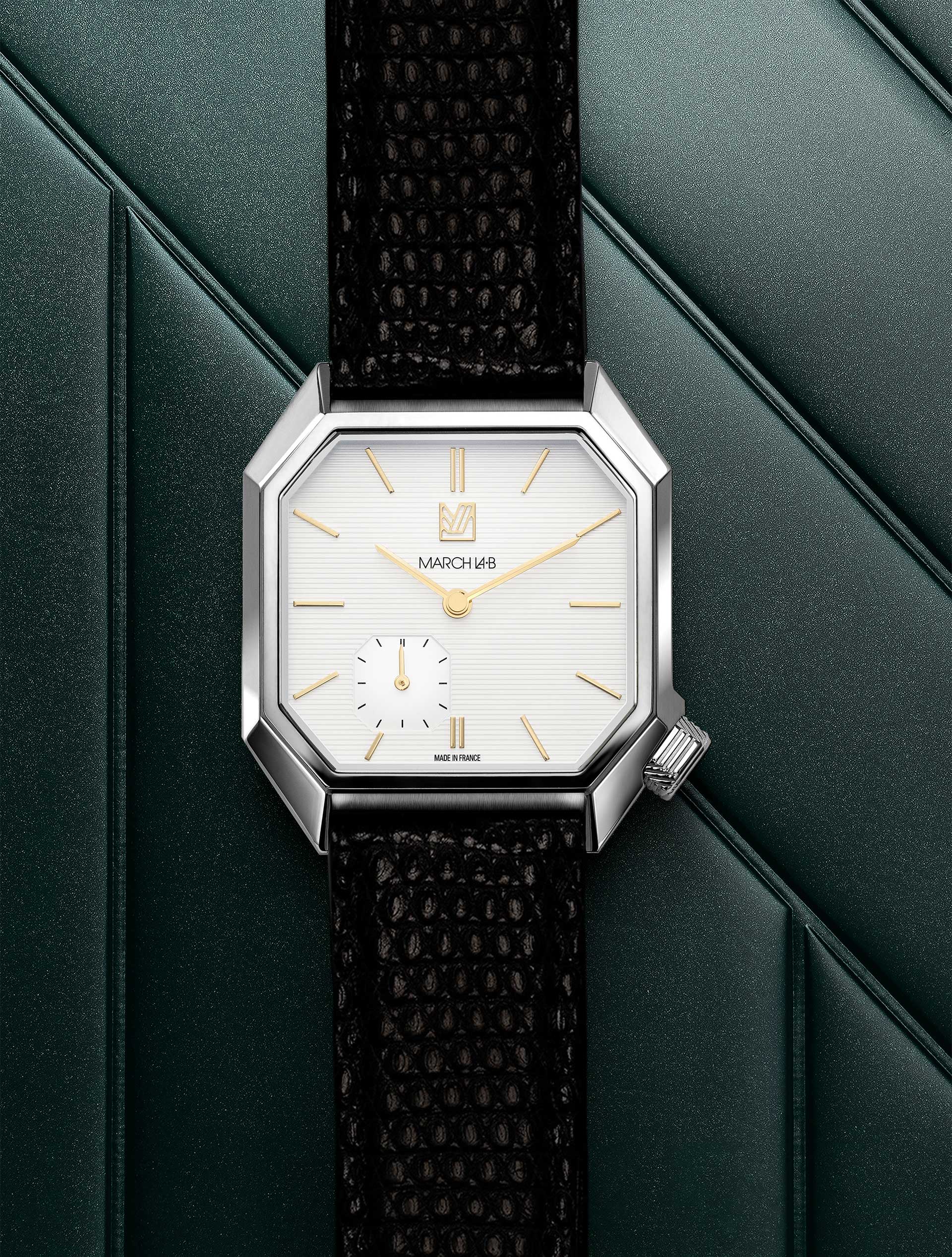 Son boiter octogonal renferme un cadran réduit à l’essentiel disponible dans une version avec de discrets index et dans une variante guillochée au centre. L’ensemble est pur et équilibré. La couronne de la MANSART qui est octogonale comme le boitier est intégrée dans l’angle du boitier à 4H et gravée avec les lignes fétiches de March LA.B