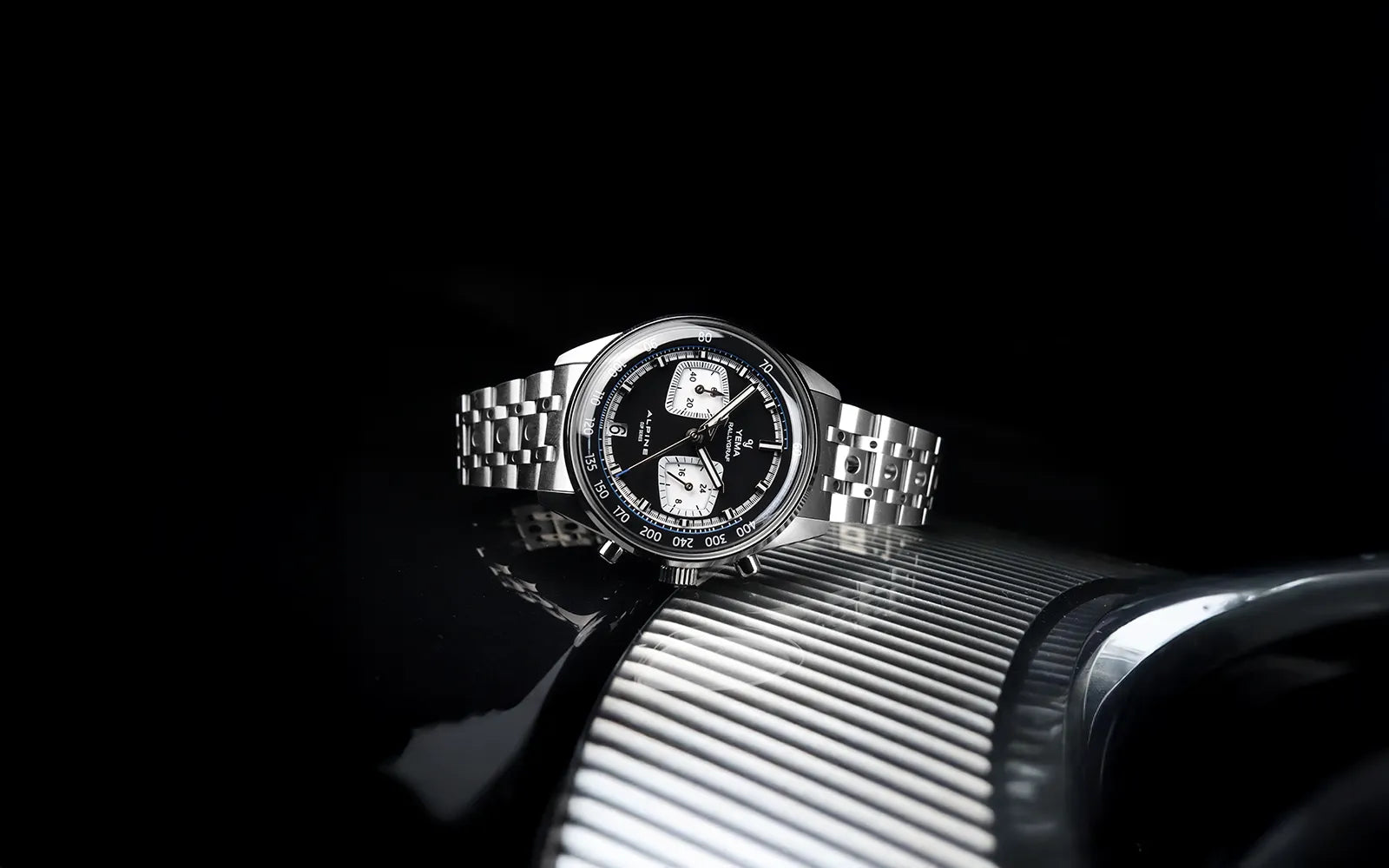 Le fond du boîtier met en valeur le logo ALPINE, soigneusement estampé à l’aide d’une presse hydraulique à haute pression pour garantir profondeur et précision. L’emblème est ensuite sublimé par un jeu de finitions polies et brossées, créant un contraste saisissant qui accentue son caractère et sa présence.