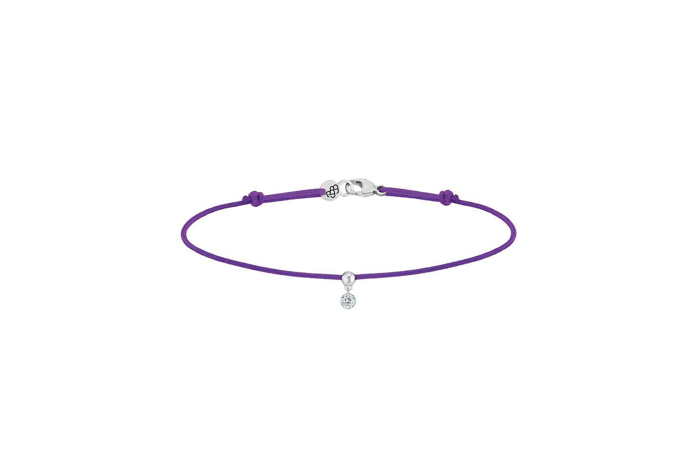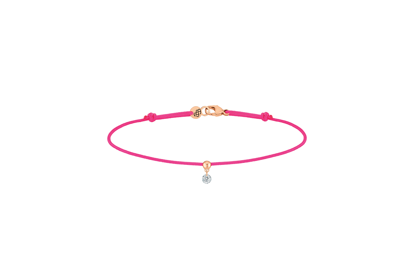 Il est monté sans serti, sur une perle en or 18kt qui coulisse sur un cordon en polyester proposé dans 10 couleurs : noir, violet, bleu, vert, gris, nude, jaune fluo, orange, rose fluo, rouge.